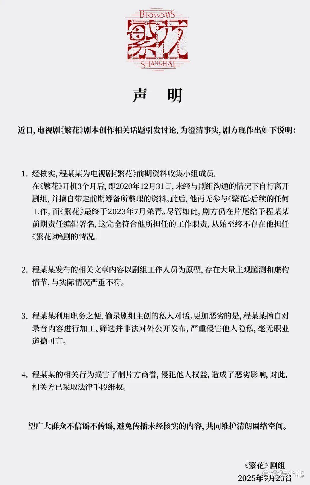 同时,还被《繁花》剧组以“严重侵害他人隐私,毫无职业道德可言”警告。