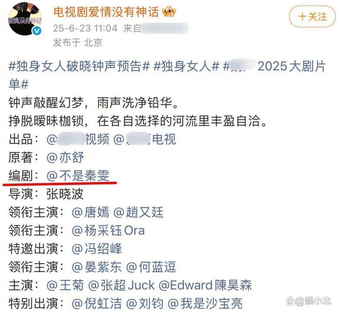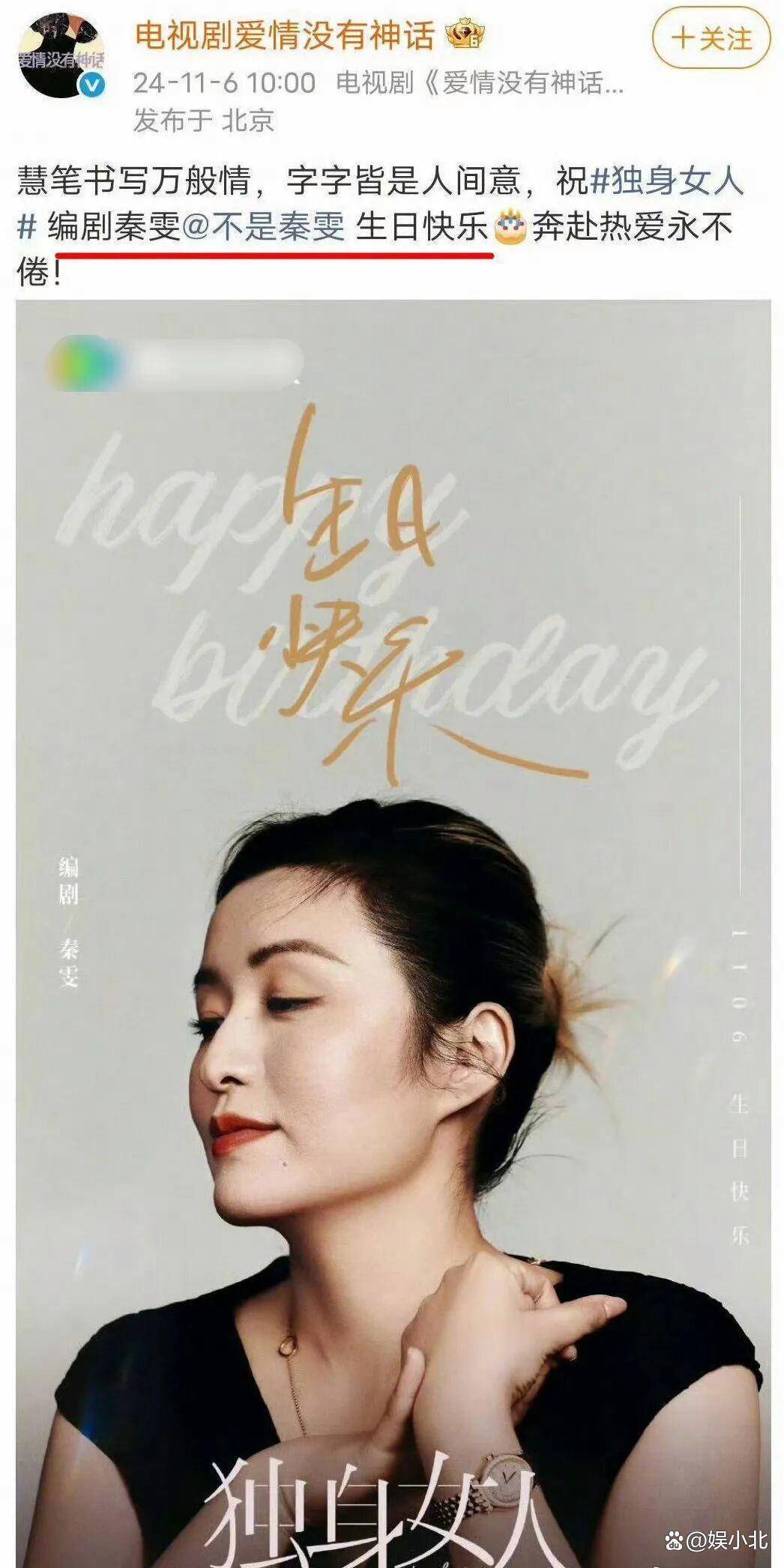 在秦雯生日时,《爱情没有神话》官博更是给秦雯发了生日单人海报,生怕观众不知道她是该部剧的编剧。