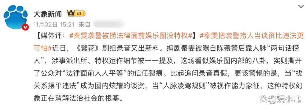 还有凤凰网,公开表示“明星不是人上人,娱乐圈没有特权”,严肃对待秦雯袭警一事。